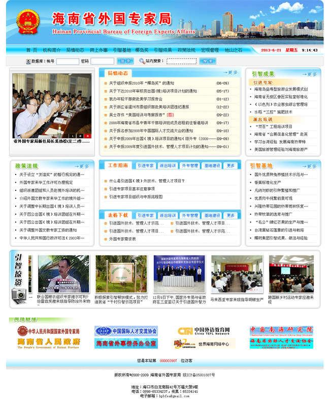 :海南省外國(guó)專(zhuān)家局是海南省政府領(lǐng)導(dǎo)下的負(fù)責(zé)全省引進(jìn)國(guó)外智力工作的歸口管理部門(mén),其主要職能包括:技術(shù)與管理人才的引進(jìn)、國(guó)內(nèi)人員的派出培訓(xùn)、文教和經(jīng)濟(jì)專(zhuān)家的管理與服務(wù)等。