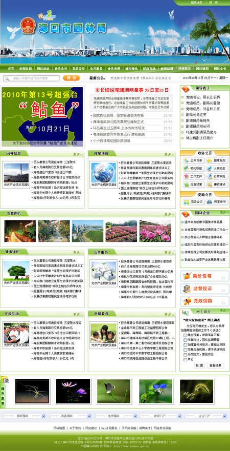 ??谑袌@林局網(wǎng)站是“??谡?wù)”門戶網(wǎng)站的組成部分,是海口市園林局宣傳國(guó)家、海南省和??谑芯G化建設(shè)管理方針、政策,展示??诔鞘芯G化風(fēng)貌,向公眾提供信息服務(wù)的對(duì)外窗口。
