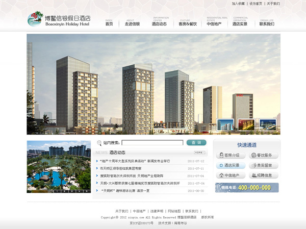 日前,博鰲信銀酒店委托我司建設(shè)酒店宣傳網(wǎng)站。 據(jù)了解, 瓊海博鰲信銀假日酒店是由中信銀行獨資公司設(shè)立,主要為本銀行系統(tǒng)內(nèi)中小型銀企會議和員工及銀行客戶的休假提供服務(wù)。